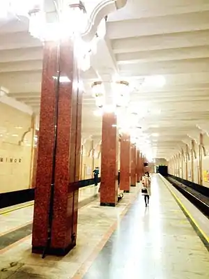 The station is decorated with columns made of red granite and located at the center of the platform. The walls are decorated with marble dark colors.