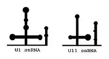The minor spliceosome consists of U11, U12, U4atac, and U6atac, together with U5 and an unknown number of non-snRNP proteins. The U11, U12 and U4atac/U6atac snRNPs are functional analogs of the U1, U2 and U4/U6 snRNPs in the major spliceosome.[2][3][4][5][6] Although the minor U4atac and U6atac snRNAs are functional analogs of U4 and U6, respectively, they share only limited sequence homology (c. 40%). Furthermore, the sequence of U11 in comparison with U1, as well as U12 compared with U2, are completely unrelated. Despite this fact, the minor U11, U12, U4atac and U6atac snRNAs can be folded into structures similar to U1, U2, U4 and U6, respectively.[7]