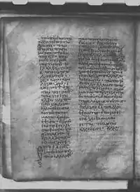 The codex contains the texts of the Gospel of Matthew (1:17-5:30; 17:24-24:29; 27:60-28:20) and Gospel of Mark (1:1-32), on 29 parchment leaves (size 28.6 cm by 21.9 cm).[3][4] The text is written in two columns per page, 27 lines per page.[3][5]