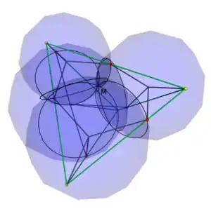 There is also a three-dimensional analog, in which the four spheres passing through a point of a tetrahedron and points on the edges of the tetrahedron intersect in a common point.[3]