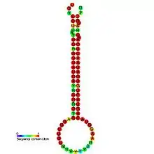 miR-101 microRNA precursor is a small non-coding RNA that regulates gene expression. Expression of miR-101 has been validated in both human (MI0000103, MI0000739)[1] and mouse (MI0000148).[2] This microRNA appears to be specific to the vertebrates and has now been predicted or confirmed in a wide range of vertebrate species (MIPF0000046). The precursor microRNA is a stem-loop structure of about 70 nucleotides in length that is processed by the Dicer enzyme to form the 21-24 nucleotide mature microRNA. In this case the mature sequence is excised from the 3' arm of the hairpin.