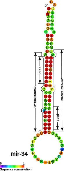 The miR-34 microRNA precursor family are non-coding RNA molecules that, in mammals, give rise to three major mature miRNAs. The miR-34 family members were discovered computationally[1] and later verified experimentally.[2][3] The precursor miRNA stem-loop is processed in the cytoplasm of the cell, with the predominant miR-34 mature sequence excised from the 5' arm of the hairpin.[4]