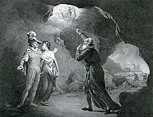 The Tempest's second scene begins with Miranda, begging her father to spare the lives of the men at sea. She's fully aware of the powers Prospero possesses and begs him to cease the storm. In an act of bravery she challenges her father's wisdom, arguing that: "Had I been any god of power, I would / Have sunk the sea within the earth or ere / It should the good ship so have swallow'd and / The fraughting souls within her."[2] As the scene progresses it is revealed to her that she is, in fact, the Princess of Milan.