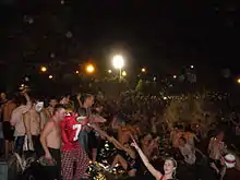 It was a tradition for students to jump into the lake at night in the week leading up to the annual football game between the Ohio State Buckeyes and the Michigan Wolverines. Although students have jumped into Mirror Lake since 1969, the modern tradition started in 1990 when Jim Jones led a parade of students on a traditional march around campus. At the end of the parade — at Mirror Lake — students made the celebratory jump.[6] Approximately 12,000 people either jumped or were near the lake for the 2009 jump.[7] Jumps have occurred several times outside of Michigan Week, including on the night of May 1, 2011 when students jumped into the lake in the wake of the death of Osama bin Laden.[8] The Mirror Lake Jump events were not university sponsored, and people were encouraged by university officials to not participate in the events.[9] The tradition ended in the mid-2010s after a student death occurred, and the university began enforcing policies to prevent jumps from occurring.[10] Jumping into Mirror Lake is a fourth-degree misdemeanor, however police acknowledged that they ignored this during jump events in order to focus on the safety of those present.[11]