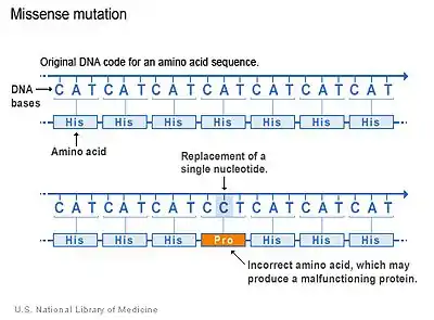 In genetics, a missense mutation is a point mutation in which a single nucleotide change results in a codon that codes for a different amino acid.[1] It is a type of nonsynonymous substitution.