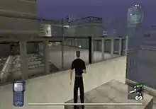 Many levels can be completed in a nonlinear order and require players to use numerous high-tech gadgets.[3] For example, the Facemaker gadget disguises Hunt as another character, allowing the player to infiltrate restricted areas.[1] Other notable gadgets like night vision glasses, smoke generators, and a fingerprint scanner are also featured.[4] To neutralize enemies, the player can use a variety of weapons, including a silenced pistol, an Uzi submachine gun, a dartgun, an electroshock weapon, and a mini-rocket launcher.[4] Combat takes place in real-time and the player is free to set on a manual aiming mode that uses an over the shoulder perspective. When the player is in aiming mode, Hunt becomes translucent and a crosshair is visible on the screen, allowing the player to shoot in any direction.[5]