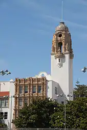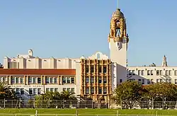 In 1922, the original Mission High School was destroyed by fire.[8] The present Mission High School complex was then constructed in a California Churrigueresque style between 1925 and 1927, during the height of San Francisco's "Golden Age" of school construction. John W. Reid, Jr., San Francisco's City Architect, was the designer.[9] The elaborate ornamentation on the school is likely due in part to the visual proximity to the nearby Mission Dolores Basilica, which features towers and ornamentation in the Churrigueresque architectural style.