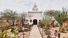 Mission San Xavier del Bac (Spanish: La Misión de San Xavier del Bac) is a historic Spanish Catholic mission located about 10 miles (16 km) south of downtown Tucson, Arizona, on the Tohono O'odham Nation San Xavier Indian Reservation. The mission was founded in 1692 by Padre Eusebio Kino[1] in the center of a centuries-old settlement of the Sobaipuri O'odham, a branch of the Akimel or River O'odham located along the banks of the Santa Cruz River. The mission was named for Francis Xavier, a Christian missionary and co-founder of the Society of Jesus (Jesuit Order) in Europe. The original church was built to the north of the present Franciscan church. This northern church or churches served the mission until it was razed during an Apache raid in 1770.