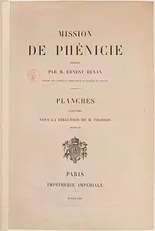 The Mission de Phénicie was the first major archaeological mission to Lebanon and Syria. It took place in 1860-61 by a French team led by Ernest Renan. Renan was entrusted with the mission in October 1860, after French interest had been sparked by the 1855 discovery of the Eshmunazar II sarcophagus.[1]