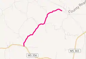MS 367 starts at a three-way junction with MS 356 east of Jacinto and travels northward. The route turns northeastward at CO 343,[2] and enters a forested area.[5] The road turns eastward briefly past CO 349, before returning northeastward at CO 358. South of the Redmont Railway, the route turns southeastward,[2] and ends at the Alcorn–Tishomingo county line near Leedy.[1][5] The road continues as CO 209, which travels to MS 365.[5]
