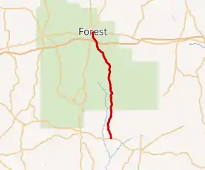MS 501 begins at a stop-controlled T intersection to the west of Sylvarnea's town limits. The highway heads north through a mostly wooded area with some homes and fields dotting the surroundings. The road crosses into Bienville National Forest, but the general landscape is simiar to what it was outside of the national forest. MS 501 passes through the unincoporated community of Pineville where a general store, a church, and some houses are in the vicinity. After crossing into Scott County, the road's general direction changes slightly to the north-northeast, still within the national forest. The state highway passes through the community of Norris and crosses over Interstate 20 without an interchange and the road forms the boundary of Forest's city limits. MS 501 passes a softball field and arena complex before entering a more residential neighborhood of the city where it follows Main Street. The highway passes a Koch Foods plant before shifting its course slightly to the west. At Oak Street, state maintenance of MS 501 ends and the road falls under city maintenance. The road crosses a railroad at-grade before entering the city's central business district. At 1st Street, MS 501 makes a pair of 90-degree turns in front of the Scott County Courthouse. After passing businesses for two blocks, MS 501 ends at an intersection with US 80. The road continues as Hillsboro Street.[2]