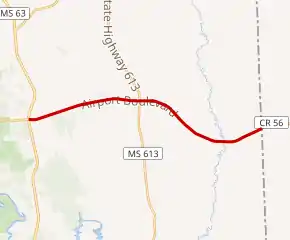 MS 614 begins in the community of Wade at an intersection with MS 63; the road continues west as Wade–Vancleave Road to cross the Pascagoula River and connect to the community of Vancleave and MS 57. It heads northeast to leave Wade and travel through woodlands for a few miles to pass through the community of Hurley, where it has a junction with MS 613 at the main crossroads at the center of town. The highway leaves Hurley and heads southeast through farmland for several miles, where it crosses the Escatawpa River before curving back northeastward for a couple miles to come to the Alabama state line. MS 614 comes to an end and the roadway continues east as CR 56 (Airport Boulevard) into the city of Mobile.[2]