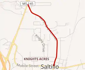 All of the route is in Lee County.[2] MS 766 starts at MS 363 in downtown Saltillo, and travels north. The road, known as North Third Avenue, goes through residential areas inside the town. Just past Cemetery Road, a side road providing access to Lake Lamar Bruce, MS 766 turns northwest towards MS 145. The street intersects a few more driveways and small streets before ending at MS 145. The road continues on as North 3rd Avenue.[3]