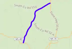 All of MS 902 is located in Smith County.[2] In 2018, the Mississippi Department of Transportation (MDOT) calculated 210 vehicles traveling on MS 902 north of County Road 32-A (CO 32-A) on average each day.[3] The road is legally defined in Mississippi Code § 65-3-3, as both MS 902 and MS 35 Connector,[4] but it is signed as MS 902.[5] The route is maintained by MDOT as part of the Mississippi State Highway System.[1]