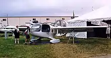 The resultant design was a shoulder-winged monoplane powered by a single Allison T63 turboprop engine driving a pusher ducted propeller. The aircraft's structure was made completely of fiberglass, making the Marvel the first example of an all-composite aircraft.[4] The boundary layer control system used a blower driven by the engine to draw suction through more than one million tiny holes in the wings and fuselage, while instead of conventional flaps the Marvel used a form of wing warping to deflect the wing trailing edges to vary the wing's camber.[1] The aircraft's tail surfaces were attached to the duct around the propeller, extending behind the duct. The undercarriage, of the so-called "Pantobase" configuration, with tandem wheels fitted within two sprung wooden pontoons, was meant to allow operation from rough surfaces, or even from water.[3][5][6] It was constructed mainly of fiberglass, with steel used for reinforcement and as heat shields around the engine.[7]