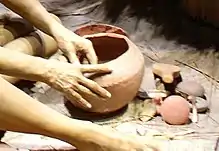 The potters used slab-built construction and the "coiling" method,[3][4] which involved working the clay into a long string which was wound round to form a shape and then modeled to form smooth walls. The potter's wheel was not used by pre-contact Native Americans. Some decoration of the clay was done at this stage by incising, defenstrating, adding shapes, or stamping designs into the wet clay. After the piece had dried completely, it was fired in a wood fire.