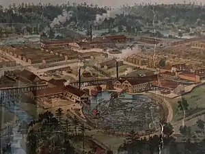 The town was planned by a company architect/engineer with a main street that had the company store, a hospital, hotel and other commercial buildings, surrounded by large lawns and decorative landscaping. Residential streets were laid out for up to 1000 houses. Just outside of town were a railway roundhouse, blacksmith and other machine shops. Between the town and the mills on the east was an 80 acres (32 ha) lumberyard.[3] The headquarters building was the town's financial center where employees were paid monthly on the 10th. It had a vault and teller booth.[lower-alpha 2][5]