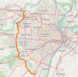 Route 141, also known as Woods Mill Road in parts of St. Louis County,[2] is a state highway located in the western St. Louis metropolitan area. Its northern terminus is at Route 370 in Bridgeton; its southern terminus is at U.S. Route 61/U.S. Route 67 in Arnold, in Jefferson County. The northern stretches of the highway are often referred to as the Maryland Heights Expressway or Earth City Expressway.
