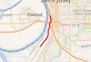 Route 759 is a short state highway in the city of St. Joseph, in Buchanan County, Missouri. The route runs for about 2.126 miles (3.421 km) under the monikers of Stockyards Expressway and South Second Street beginning at an intersection with West Florence Road. The southern terminus of Route 759 is at an at-grade intersection with Southwest Lower Lake Road in the stockyards section of the city. Paralleling two railroad lines, Interstate 229 (I-229) and the nearby Missouri River, Route 759 eventually weaves for more dense parts of the city, intersecting with U.S. Route 36 (US 36) before merging northbound into I-229 and US 59.