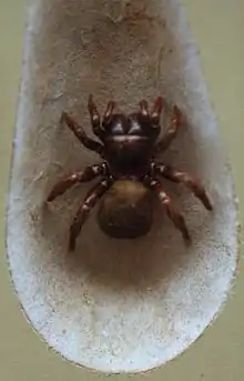 Eastern mouse spiders are often mistaken for Australian funnel-web spiders.[5] The females are large and very strong, with powerful chelicerae.[6] Their fangs often cross over slightly, while those of Australian funnel-web spiders remain parallel,[3] and the latter often have a drop of venom on their fang tips and have longer spinnerets.