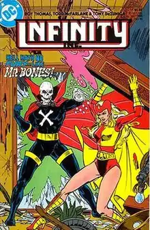 Mister Bones (Robert Todd) is a fictional character in the DC Comics Universe, created by Roy Thomas, Dann Thomas, and Todd McFarlane, in Infinity, Inc. #16 (July 1985).[1] A former low-level supervillain, he reformed and joined the Infinity Inc. team, then later the (fictional) Department of Extranormal Operations (a government agency which regulates superhero activity) as a bureaucrat, eventually rising to the rank of Regional Director for the Eastern Seaboard. Thus, he now wears a suit and tie instead of a costume, and is also known as Director Bones.[2] A chain-smoker, he had a habit of speaking in rhyme in early appearances, but he no longer does so.