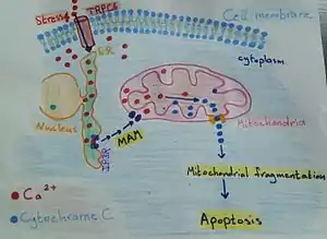 These contact sites have been associated with the delicate balance between life and death of the cell. Isolation membranes are the initial step to form auto-phagosomes. These closed membranes are double membrane-bond, with lysosomes inside it. The main function of these membrane is degradation, as role in cellular homeostasis. However, the origin of them has remained unclear. Maybe it is the plasma membrane, the endoplasmic reticulum (ER) and the mitochondria. But the ER- mitochondria contact site have markers, the auto-phagosome marker ATG14, and the auto-phagosome-formation marker ATG5, until the formation of auto-phagosome is complete. Whereas, the absent of ATG14 puncta, it is caused by the breakdown of the ER–mitochondria contact site [3] The oxidative stress and the beginning of endoplasmic reticulum (ER) stress occur together; the ER stress have a key sensor enriched at the mitochondria-associated ER membranes (MAMs). This key is PERK (RNA-dependent protein kinase (PKR)-like ER kinase), PERK contributes to apoptosis twofold by sustaining the levels of pro-apoptotic C/EBP homologous protein (CHOP).[4] A tight ER–mitochondria contact site is integral to the mechanisms controlling cellular apoptosis and to inter-organelle Ca2 + signals. The mitochondria-associated ER membranes (MAMs), play role in cell death modulation. Mitochondrial outer membrane permeabilization (MOMP), is a reason of the higher matrix Ca2 + levels, which is acts as a trigger for apoptosis. MOMP is the process before apoptosis, which is accompanied to permeability of the inner membrane of the mitochondria (IMM). Permeability transition pore (PTP) opening induces mitochondrial swelling and outer membrane of the mitochondria (OMM) rupture. Moreover, PTP opening induce releasing of caspase-activating factors and apoptosis. Caspase-activating factors induced by cytochrome C to bind to the IP3R, this will result in higher Ca2 + transfer from the ER to the mitochondria, amplifying the apoptotic signal.[5]