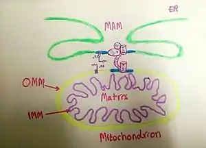 Mitochondria-associated membranes (MAM) represent a region of the endoplasmic reticulum (ER) which is reversibly tethered to mitochondria. These membranes are involved in import of certain lipids from the ER to mitochondria and in regulation of calcium homeostasis, mitochondrial function, autophagy and apoptosis. They also play a role in development of neurodegenerative diseases and glucose homeostasis.[1]