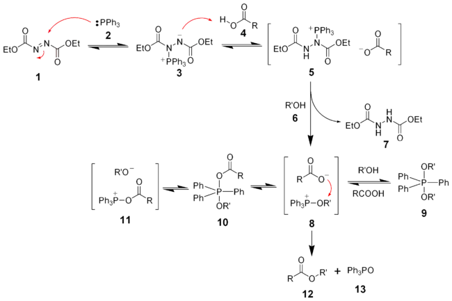 Initially, the triphenyl phosphine (2) makes a nucleophilic attack upon diethyl azodicarboxylate (1) producing a betaine intermediate 3, which deprotonates the carboxylic acid (4) to form the ion pair 5. DEAD itself deprotonates the alcohol (6) forming an alkoxide that can form the key oxyphosphonium ion 8. The ratio and interconversion of intermediates 8–11 depend on the carboxylic acid pKa and the solvent polarity.[7][8][9] Although several phosphorus intermediates are present, the attack of the carboxylate anion upon intermediate 8 is the only productive pathway forming the desired product 12 and triphenylphosphine oxide (13).