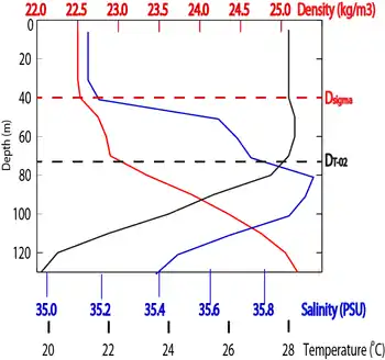 In the past, a typical criterion for MLD was the depth at which the surface temperature cools by some change in temperature from surface values. For example, Levitus[5] used 0.5 °C. In the example to the right, 0.2 °C is used to define the MLD (i.e. DT-02 in the Figure). Prior to the abundant subsurface salinity available from Argo, this was the main methodology for calculating the oceanic MLD. More recently, a density criterion has been used to define the MLD. The density-derived MLD is defined as the depth where the density increases from the surface value due to a prescribed temperature decrease of some value (e.g. 0.2 °C) from the surface value while maintaining constant surface salinity value. (i.e. DT-02 - Dsigma).