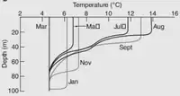 Formation of a mixed layer in a lake is similar to that in the ocean, but mixing is more likely to occur in lakes solely due to the molecular properties of water. Water changes density as it changes temperature. In lakes, temperature structure is complicated by the fact that fresh water is heaviest at 3.98 °C (degrees Celsius). Thus in lakes where the surface gets very cold, the mixed layer briefly extends all the way to the bottom in the spring, as surface warms as well as in the fall, as the surface cools. This overturning is often important for maintaining the oxygenation of very deep lakes.