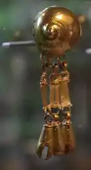 In the Oaxacan area, the Mixtecs also adopted metallurgy during the Postclassic period. Copper axes have been found in the area, showing that metallurgy in pre-Hispanic Oaxaca was not only for ornamental purposes.[68] The best known pieces of Mixtec goldsmithing are the gold pieces. Gold was considered by the Mesoamericans as excrement of the gods and during the Postclassic period it became a sign of the Sun. For this reason, some of the most exquisite pieces of Mixtec gold work combine gold with turquoise, the solar stone par excellence in Mesoamerican culture.[69] This is the case of the Shield of Yanhuitlán, one of the best known pieces of Mixtec goldsmithing.