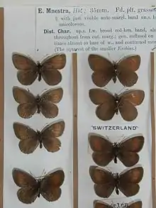 E. mnestra Hbn. (36 c, d). Shape as in melampus, but larger. The band on the forewing of the male is reddish or brownish yellow and distally sharply defined, proximally more or less shading off into the black-brown ground-colour. In this band there are sometimes 2 small black pupils near the apex, which are mostly absent. The hindwing has sometimes a brown band separated by the veins into 3-4 spots, which may be absent. The forewing beneath is russet-brown, the costal and distal margins being dark brown like the hindwing. The female is somewhat lighter in colour, the band of the forewing is russet-yellow and on both sides sharply limited, bearing 2 usually white-centred ocelli, which are visible also on the underside. Specimens in which the band is especially prominent bear in the same 2—3 small black ocelli with white centres. The band, however, is mostly absent, being represented only by some diffuse brown spots. Underside of the forewing as in the male, but the band lighter, and the wing russet-brown from the band to the base. The hindwing beneath light brown, dusted all over with yellowish grey atoms, the wing being centrally crossed by a but slightly lighter band, which is somewhat dentate on both sides. Antenna black above, white beneath. In the Swiss and Tyrolese Alps, but local. — gorgophone Bell., from South France, is smaller and has a broader band.[2]