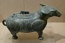 An earlier Western Zhou example is a Baoji Bronzeware Museum zoomorphic zun wine vessel discovered in the 1970s at Rujiazhuang (茹家莊), Baoji, Shaanxi, with a long snout serving as the spout, and which the preliminary report described as sheep-shaped with curled horns. Hayashi Minao (林已奈夫 1983) identified this animal as a tapir, and treated the zoologically impossible horns as whorl-shaped ears that signified the tapir's supernatural power of hearing, without any supporting evidence. Sun Ji (孫機 1986) also believed it was a stylized Malaysian tapir, and recognized it as the chimerical elephant-trunked mo that Bo Yuji described, ignoring the uniform early descriptions of the mo as bear-like (Harper 2013: 197-199).