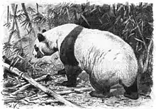The giant panda or panda bear (Ailuropoda melanoleuca) is a large, black and white bear native to mountainous forests in South Central China. Its habitat is mainly in Sichuan, but also in neighboring Shaanxi and Gansu. The panda's coat is mainly white with black fur on its ears, eye patches, muzzle, shoulders, and legs. Despite its taxonomic classification as a carnivoran, the giant panda's diet is primarily herbivorous, consisting almost exclusively of bamboo.