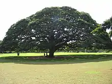 The Hitachi tree, a large monkeypod tree with a distinctive umbrella-shaped canopy, grows in the middle of a grassy area in the middle of the park. The tree is registered as an exceptional tree by the City and County of Honolulu and cannot be removed or destroyed without city council approval.