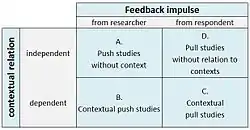 Push studies without contexts (A) are conducted independently from time and location. This can be CATI- or CACI-studies as well as surveys by SMS or MMS. In cases of these research methods, the feedback impulse actively comes from the researcher. With contextual push studies (B) the researcher prompts the respondent to give appropriate feedback once it is recognized that he/she is located in a particular environment or is in a certain situation.[10] Pull studies are characterized that participants call in the questionnaire themselves. In many cases short notes draw attention to a survey or an evaluation. Such communications may be placed in certain contexts (C) (e.g. on receipts, advertisements or product packaging) in order to encourage participation. Non-context-sensitive pull studies (D) are not relevant for marketing research since they provide only general feedback, which has no relation to a fixed object of research. Therefore, they are hardly controlled and evaluated.[11]