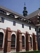 The architectural complex includes the stuccoed Polish Gothic church, the Basilica of the Holy Cross (Polish: Bazylika Krzyża Świętego), which serves as the Parish Church of St. Bartholomew the Apostle as well as the abbey church for the monks. There is also the Polish Renaissance-style abbot's palace, built around 1569, as well as the red-brick monastery, with a broad inner courtyard, outbuildings, vegetable garden, greenhouse, etc.[3]