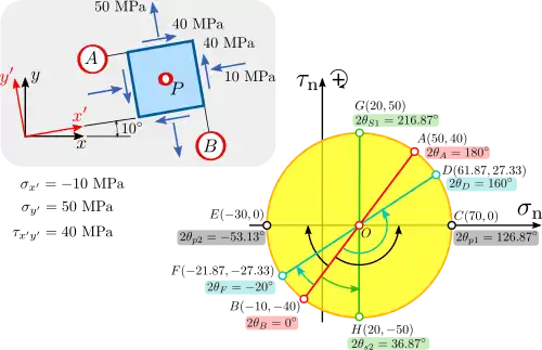 From the Pole, we draw lines to different points on the Mohr circle. The coordinates of the points where these lines intersect the Mohr circle indicate the stress components acting on a plane in the physical space having the same inclination as the line. For instance, the line from the Pole to point C in the circle has the same inclination as the plane in the physical space where acts. This plane makes an angle of 63.435° with plane B, both in the Mohr-circle space and in the physical space. In the same way, lines are traced from the Pole to points E, D, F, G and H to find the stress components on planes with the same orientation.