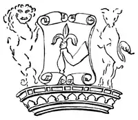 - Nicholas IV Carew (1444–1470), son and heir apparent, who married Margaret Dynham (d.1471), a daughter of Sir John Dynham (1406–1458) of Nutwell in the parish of Woodbury and of Hartland, both in Devon, and a sister and co-heiress of John Dynham, 1st Baron Dynham (c. 1433–1501),[52] Lord High Treasurer of England and Lord Chancellor of Ireland. Her mother was Joan Arches (died 1497), sister and heiress of John Arches and daughter of Sir Richard Arches (died 1417), a Member of Parliament for Buckinghamshire in 1402, of Eythrope, Cranwell (both in the parish of Waddesdon) and Little Kimble, Buckinghamshire.[53] The purbeck marble chest tomb of Nicholas IV Carew survives in the Chapel of St Nicholas in Westminster Abbey, the ledger stone of which bore a Latin inscription, now effaced. The Devonshire biographer Prince (d.1723) wrote concerning this monument "To whose memory an antient plain tomb of gray marble is there still seen erected with an inscription in brass round the ledg, and some coats of arms on the pedestal".[54] The inscription and arms were still remaining in 1733, but had disappeared by 1877.[55] The Latin epitaph was recorded by Prince as follows:[56]
