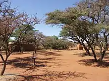 This region is the transition zone of the savanna (Kalahari and Nama Karoo) biomes; the former being flat and sandy dotted with camel thorns, umbrella thorns, puzzle bushes and haystack-like sociable weaver nests constructed in the larger trees, and the latter characterised by rocky lava outcrops, calcrete and shales. The southern region of the park, closest to the entrance gate, is more plains-like, with isolated camel thorns and tall grasses. The central regions of the park consist of the Karoo-like habitats, with long rows of rocky outcrops interspersed with flat areas of grass and scrub. The base and lower slopes of the outcrops receive extra run-off and are better vegetated.