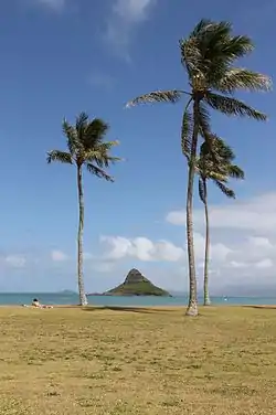Mokoliʻi (pronounced [mokoˈliʔi]), also known as Chinaman's Hat, is a basalt islet in Kāneʻohe Bay, Hawaii. Mokoliʻi is part of Kualoa Regional Park and located 1⁄3 mile (0.54 km) offshore of Kualoa Point, Oahu. The 12.5-acre (5.1 ha) islet was at one time part of a basaltic ridge on Oahu before marine erosion separated it.[1]