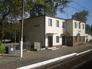 Mokrz railway station is a railway station serving the village of Mokrz, in the Greater Poland Voivodeship, Poland. The station is located on the Poznań–Szczecin railway. The train services are operated by Przewozy Regionalne.