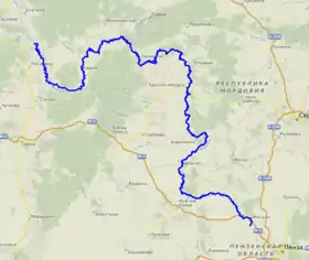 Moksha (Russian: Мо́кша, Moksha: Йов) is a river in central Russia, a right tributary of the Oka. It flows through Penza Oblast, Nizhny Novgorod Oblast, Ryazan Oblast and the Republic of Mordovia, and joins the Oka near Pyatnitsky Yar, near the city of Kasimov.