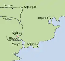 The monastery is located on a former river island in the Blackwater River but was connected to the mainland in 1806 by the construction of two dams on the west side of the mainland.[4] The site is only a few kilometers from the river mouth and the natural port of Youghal on the south coast of Ireland. The access to waterways in the early Middle Ages was of great importance as it gave easy access to travel to monasteries in Ireland, Britain, and Brittany. It is thought the monks at Molana used currachs for this purpose.[5] According to some traditions, it is known that a sea voyage in the early Christian period between Southern Ireland and Brittany could be completed in three days and nights.[6]