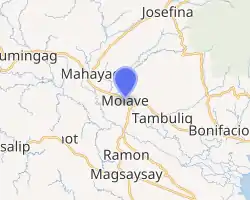 Molave, officially known as the Municipality of Molave (Cebuano: Lungsod sa Molave; Subanen: Benwa Molave; Chavacano: Municipalidad de Molave; Tagalog: Bayan ng Molave), is a 1st class municipality in the province of Zamboanga del Sur, Philippines. In the 2020 census, it had 53,140 people. [3] It is in the eastern part of the province of Zamboanga del Sur, and has an area of 21,685 hectares (83.73 square miles). The name "Molave" refers to the tree (and its hardwood) that was common in the area. Its economy is focused on agricultural production, and 1,378.5 hectares (3,406 acres) of fertile land is irrigated and planted with rice. Corn, coconut, cassava, banana, camote and various vegetables are also grown. These are marketed to neighboring towns and cities, and reach Cebu. Due to its strategic location, Molave is becoming the commercial hub of the Salug Valley.