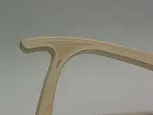 By employing laminated wood gussets (triangular), the wood joints can be pressed at the same time (see picture). The thickness of the molded parts can be varied by using partially ground interior veneers. Compared to molded plywood, the tensile strength is significantly higher.