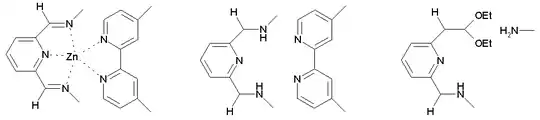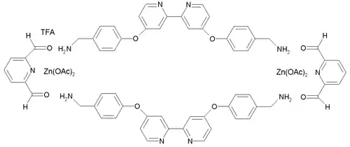 The synthesis of the macrocyclic systems involves self-assembles of two organic building blocks: 2,6-diformylpyridine (an aromatic compound with two aldehyde groups positioned ortho to the nitrogen atom of the pyridine ring) and a symmetric diamine containing a meta-substituted 2,2'-bipyridine group. Zinc acetate is added as the template for the reaction, resulting in one zinc cation in each of the six pentacoordinate complexation sites. Trifluoroacetic acid (TFA) is added to catalyse the imine bond-forming reactions.[1] The preparation of the tri-ring Borromeate involves a total of 18 precursor molecules and is only possible because the building blocks self-assemble through 12 aromatic pi-pi interactions and 30 zinc to nitrogen dative bonds. Because of these interactions, the Borromeate is thermodynamically the most stable reaction product out of potentially many others. As a consequence of all the reactions taking place being equilibria, the Borromeate is the predominant reaction product.[1]