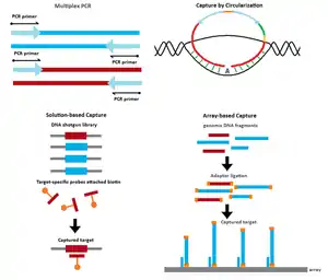| Capture by Circularization[3][5][6][15][16] | Target capture using probes containing sequences complementary to the target Hybridization of the probes to their targets results in circularized products Target enrichment via rolling circle amplification or PCR using universal primers |