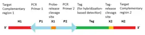 The probes are designed with sequences that are complementary to the genomic target at its 5’ and 3’ ends .[2][3][6] The internal region contains two universal PCR primer sites that are common to all MIPs as well as a probe-release site, which is usually a restriction site.[3] If the identification of the captured genomic target is performed using array-based hybridization approaches, the internal region may optionally contain a probe-specific tag sequence that uniquely identifies the given probe as well as a tag-release site, which, similar to the probe-release site, is also a restriction site.