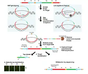 Gene selector method:[15] An initial multiplex PCR step is performed to enrich the targets of interest. The PCR products are circularized upon hybridization to target-specific probes with sequences complementary to the two primers used in the PCR step.